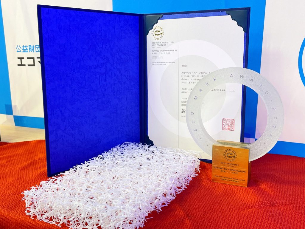 東洋紡エムシー株式会社(本社:大阪市北区、代表取締役社長執行役員 CEO:森重 地加男、以下「当社」)は、 水平リサイクル型三次元網状繊維構造体「ブレスエアーメビウス®」が、公益財団法人日本環境協会の「エコマークアワード 2024」ベストプロダクトを受賞したことをお知らせいたします。12 月 6 日には東京都内で表彰セレモニーが行われ、同協会の新美育文理事長より賞状とトロフィーが授与されました。