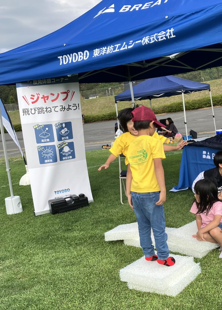 好奇心旺盛な子供達からのブレスエアーのサンプルで飛び跳ねて楽しんで、ブースの敷布団に何度も寝転がる子供達から、「ブレスエアーはどこで作っているの?」など色々と質問された事が印象に残りました。