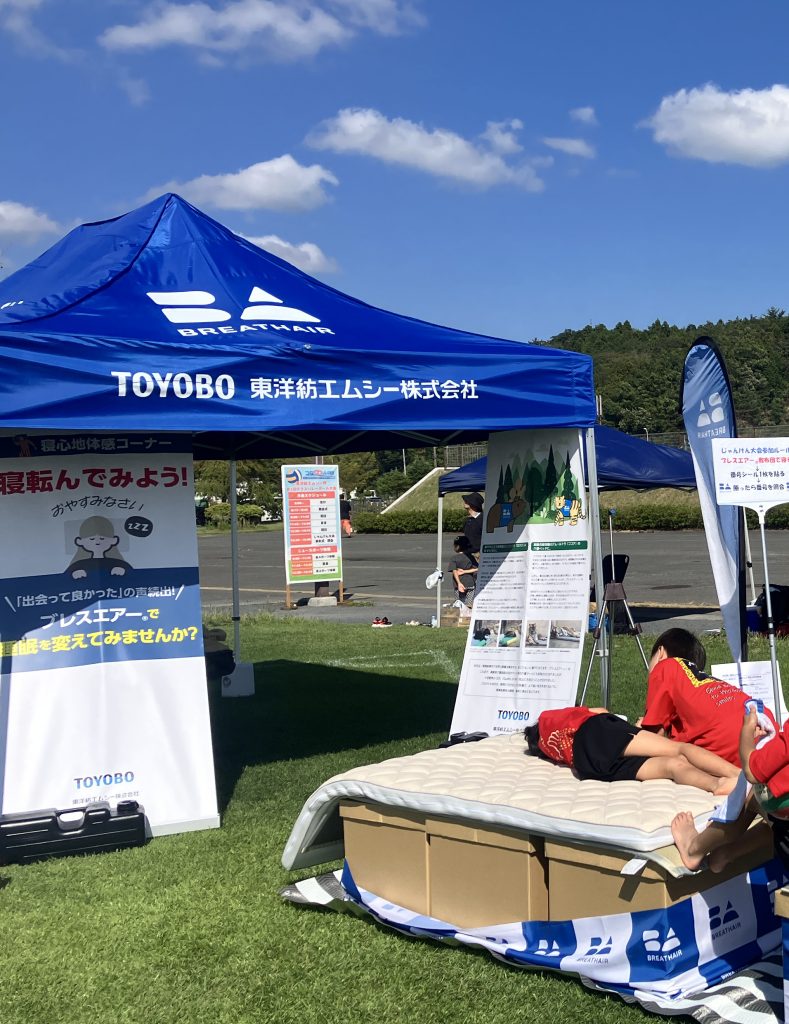 東洋紡エムシーの PR ブースでは、「ブレスエアー敷布団」「ブレスエアー原反体感コーナー」「防災寝袋展示」を設置しました。